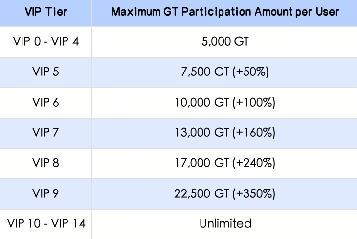 Complete identity verification and hold at least 1 GT to share the total reward pool based on your GT holdings' snapshot proportion. For this event, the participation limit for VIP0–VIP4 users is 5,000 GT, while VIP10 and above users may enjoy unlimited participation quotas.