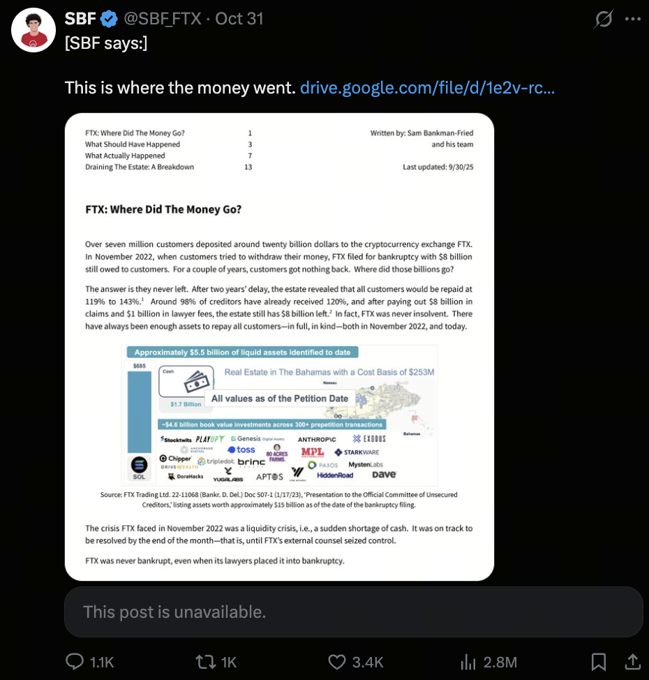 حتى وهو في السجن، يواصل SBF استخدام وسائل التواصل الاجتماعي لتشكيل صورته العامة وتقديم روايته للأحداث المرتبطة بـ FTX. ويؤكد أنه لم يحاول مطلقًا إخفاء الأموال، ويتهم محامي الإفلاس بتشويه الحقائق وإخفاء الحقيقة. وقد أعادت هذه التصريحات تسليط الضوء على قضية FTX، ما يبرز القضايا غير المحلولة في قطاع العملات الرقمية: شفافية الأموال، الرقابة القانونية، وغموض المساءلة العابرة للحدود.