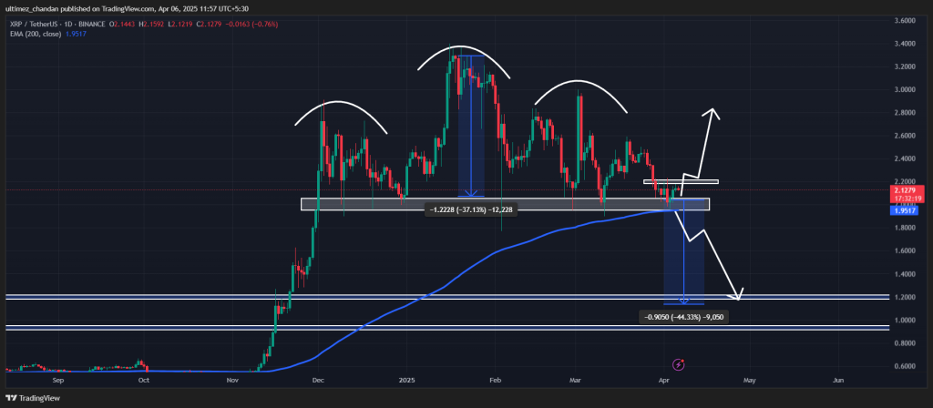 ! المصدر: Trading View ومع ذلك، على الإطار الزمني اليومي، لقد شكل XRP بالفعل نمط رأس وكتفين هابط، لكن خط العنق الخاص به يتلقى دعمًا من المتوسط المتحرك الأسي 200 (EMA)، والذي يبدو أنه يساعد الأصل على البقاء فوق المستوى الرئيسي.