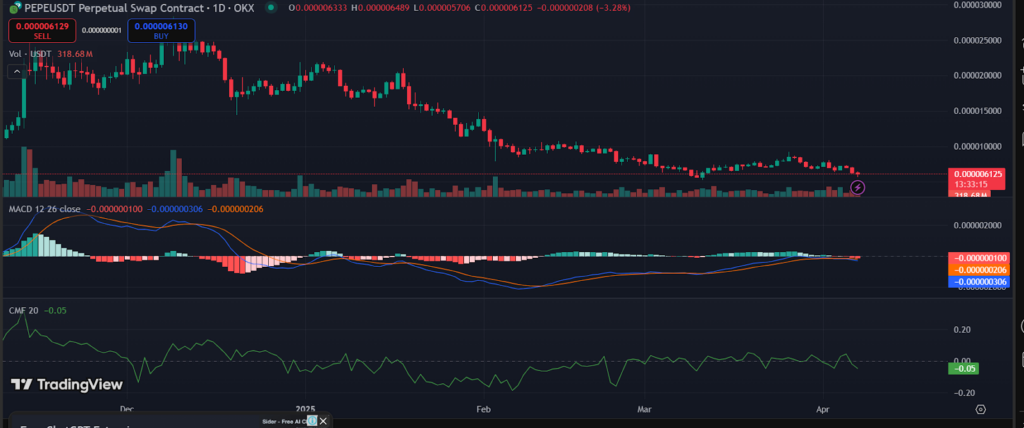 تكشف المؤشرات الفنية أن PEPE يظهر قوى سوقية هبوطية. تكشف مؤشرات تقارب وتباعد المتوسطات المتحركة عن اتجاهات سوقية سلبية لأن خطها الأزرق قصير المدى يقع تحت خطها البرتقالي طويل المدى. تشير البيانات إلى أن السعر من المحتمل أن يستمر في الانخفاض بسبب ظروف السوق الهبوطية الحالية. يظهر مؤشر CMF قيمة قدرها 0.05 مما يدل على أن المشترين لديهم اهتمام ضعيف بـ PEPE.
