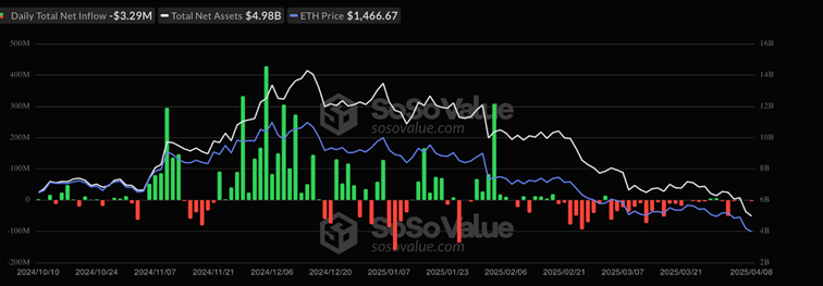 تستمر صناديق الاستثمار المتداولة في الإيثيريوم في إظهار علامات الضعف، مع تدفق خارجي صافٍ يزيد عن 3.3 مليون دولار في يوم 8/4 فقط. في الواقع، خلال الأسبوعين الماضيين، سجلت هذه المنتجات الاستثمارية تدفقًا خارجيًا صافياً بلغ مجموع 94.1 مليون دولار، في حين أن التدفق النقدي الداخل لم يتجاوز حوالي 13 مليون دولار.