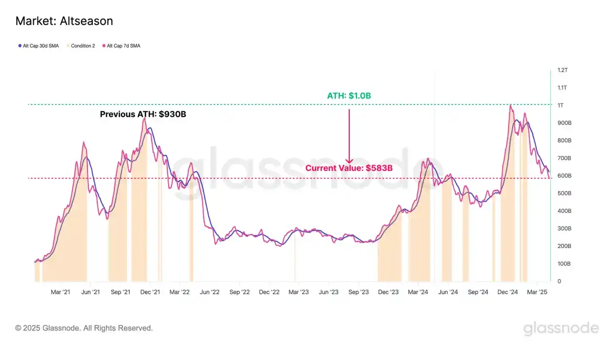 حتى ديسمبر 2024، بلغت القيمة السوقية الإجمالية للعملات البديلة (باستثناء البيتكوين والإيثيريوم والعملات المستقرة) ذروتها عند 1 تريليون دولار أمريكي في هذه الدورة. بعد ذلك، انخفضت القيمة السوقية بشكل كبير، حيث تراجعت الآن إلى 583 مليار دولار أمريكي، مع انخفاض تجاوز 40% في غضون أشهر قليلة.