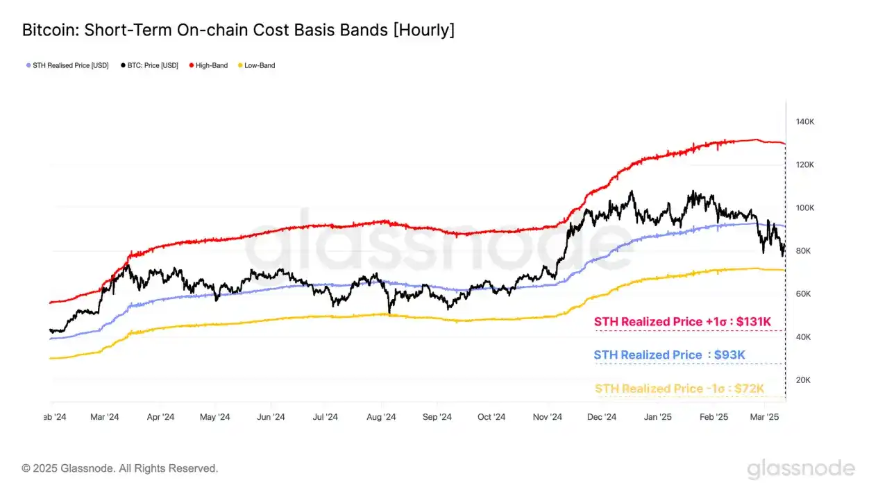 حاليًا، استقر سعر البيتكوين الفوري بين معيار تكلفة STH والانحراف المعياري السالب الأول، مما يشكل الحدود العليا والسفلى لنطاق التداول الحالي، أي من 93,000 دولار إلى 72,000 دولار.