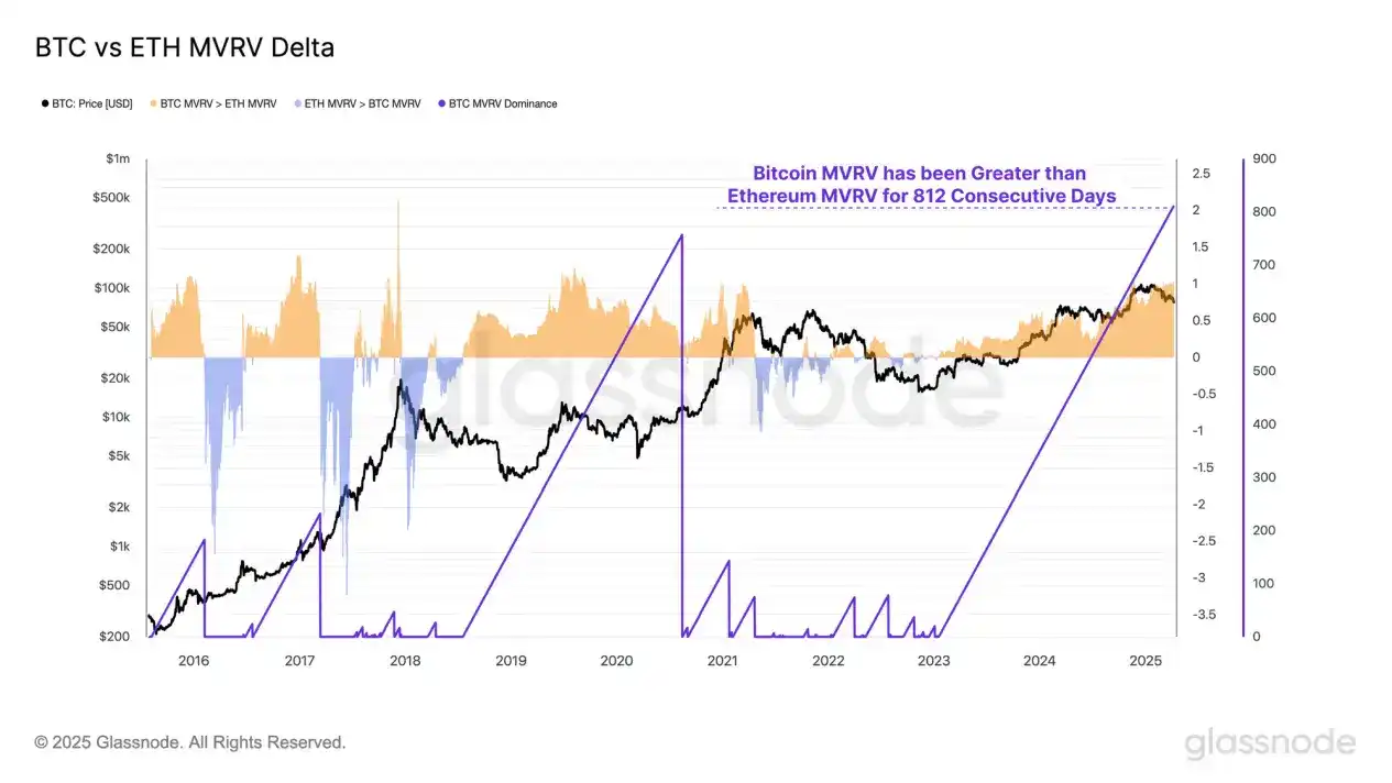 من خلال حساب الفرق بين نسبة MVRV للبيتكوين والإيثيريوم، يمكننا تحديد ما إذا كان، في بعض الفترات، العائد المحاسبي لملاك البيتكوين أفضل أو أسوأ من ملاك الإيثيريوم.