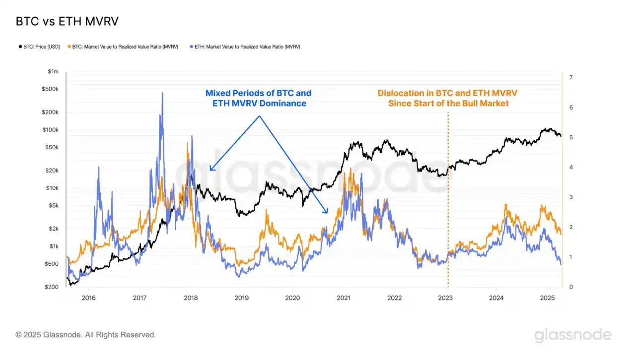 منذ بدء هذه السوق الصاعدة في يناير 2023، شهدت نسبة MVRV بين البيتكوين والإيثيريوم تباينًا واضحًا مرة أخرى. يحتفظ مستثمرو البيتكوين بربحية أعلى باستمرار، بينما انخفضت نسبة MVRV للإيثيريوم مرة أخرى تحت 1.0 في مارس من هذا العام، مما يدل على أن معظم حاملي العملات قد دخلوا منطقة الخسارة.