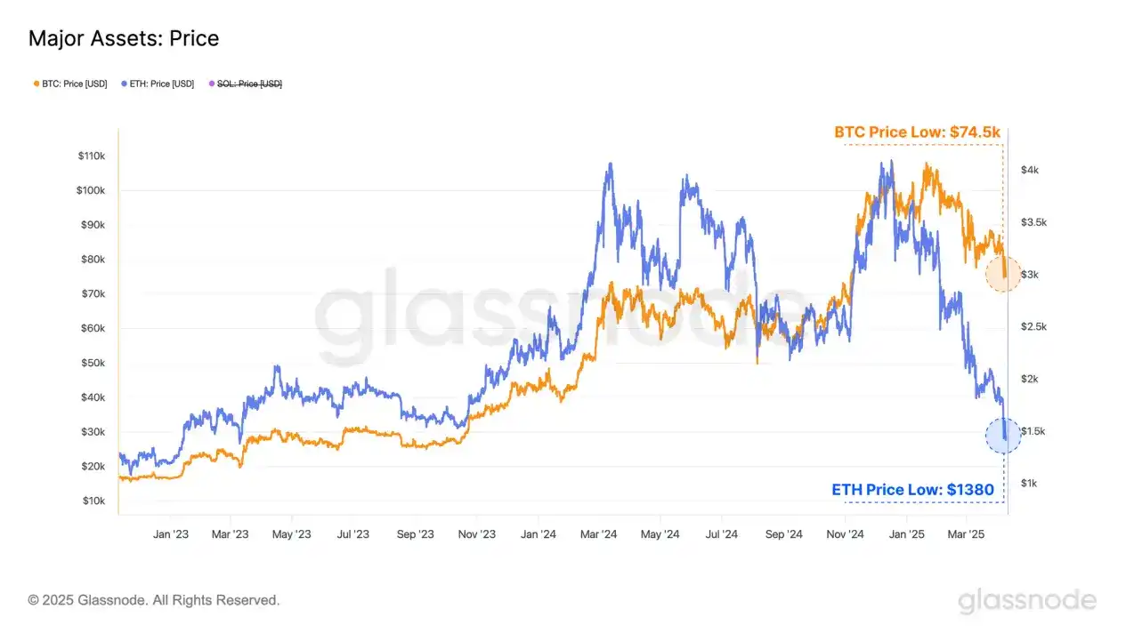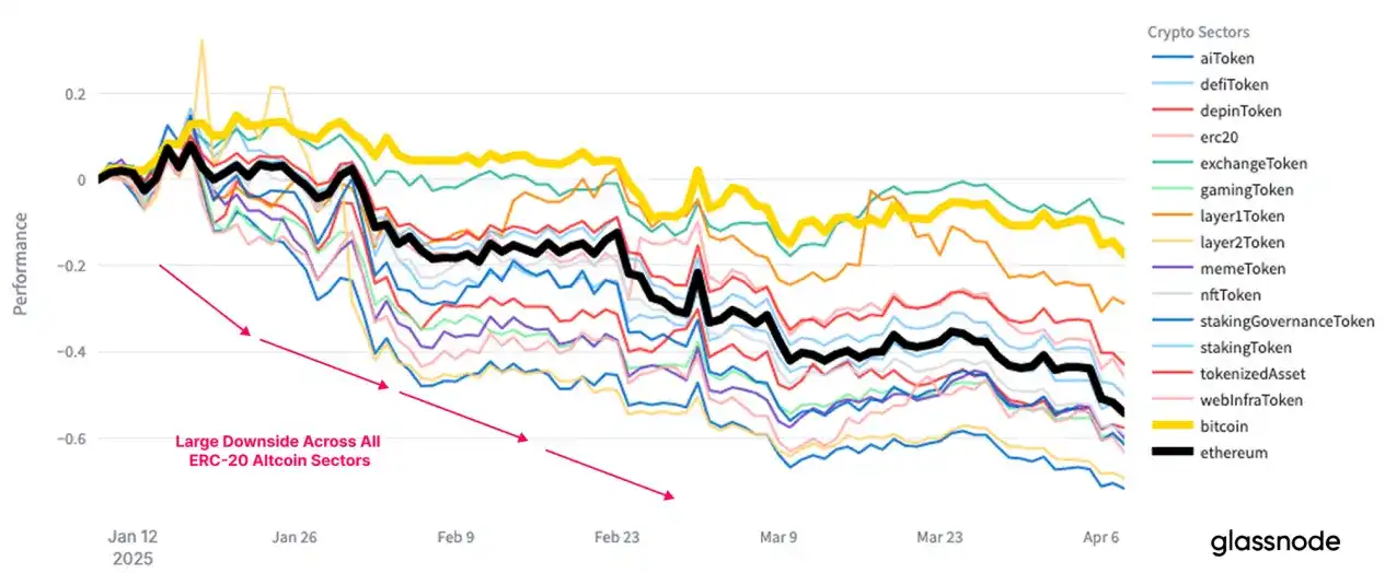 لم يسلم سوق الأصول الرقمية من هذا، حيث شهدت جميع القطاعات الفرعية انكماشًا شاملًا. انخفض سعر البيتكوين إلى 75,000 دولار، مسجلًا واحدة من أكبر الانخفاضات منذ بدء سوق الثور في يناير 2023. وكانت خسائر الإيثيريوم أكثر حدة، حيث انزلقت العديد من الأصول المشفرة ذات الذيل الطويل حاليًا في اتجاه السوق الهابطة.