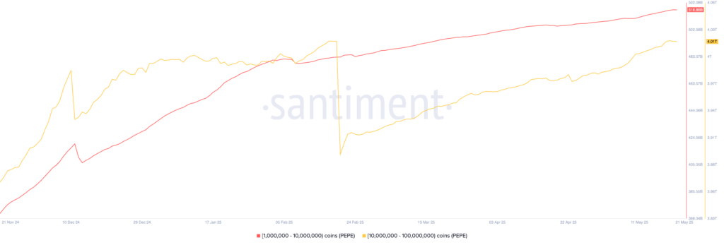 ملاك بيبي الذين يمتلكون بين 10 ملايين و 100 مليون عملة قد زادوا من ممتلكاتهم إلى أكثر من 4 تريليونات رمز، مقارنة بـ 3.9 تريليون في فبراير، بزيادة قدرها 100 مليار. بالمثل، فإن الذين يمتلكون بين مليون و 10 ملايين عملة بيبي لديهم 516 مليار عملة، ارتفاعًا من 373 مليار في نوفمبر.