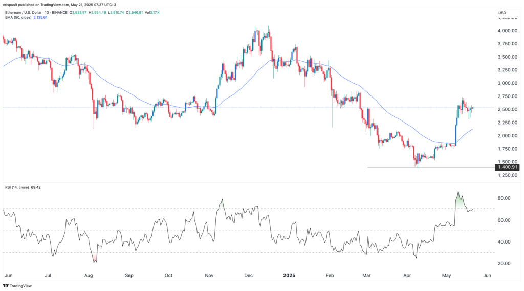 التراكم المستمر للحيتان هو علامة على أن هؤلاء المستثمرين يأملون أن يستمر سعر Ethereum في الارتفاع هذا العام. يُظهر الرسم البياني أدناه أن سعر Ethereum قد وصل إلى أدنى مستوى له عند 1,400 دولار في أبريل وقد ارتد إلى 2,550 دولار. لقد قفز فوق المتوسط المتحرك لمدة 50 يومًا ونمط العلم الصعودي.