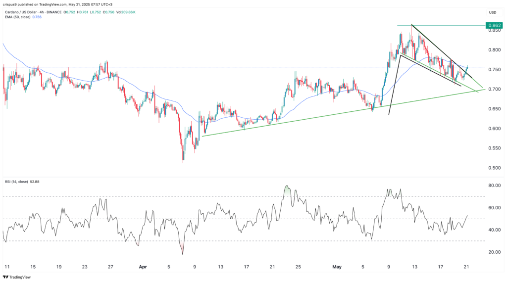سعر Cardano لديه تقنيات قوية، خاصة على مخطط الأربع ساعات. لقد شكل نموذج وتد هابط وراية صاعدة. مع اقتراب الخطين من التقاطع، هناك احتمال أن سعر ADA سيرتد في الأسابيع القادمة.