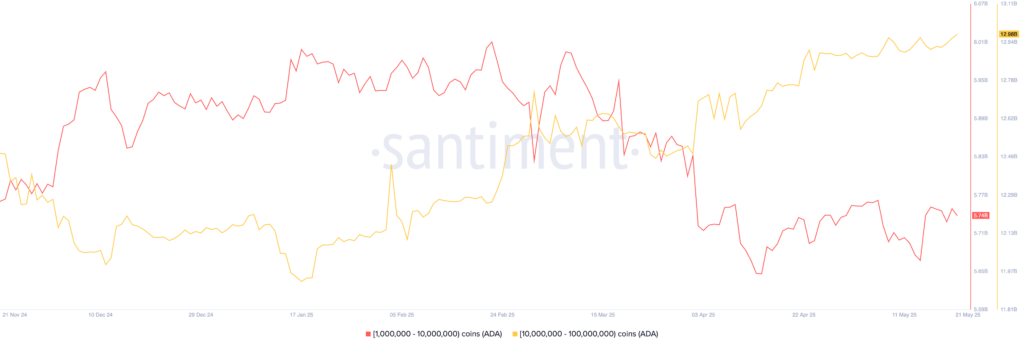 حيتان Cardano التي تمتلك بين 1 مليون و 10 ملايين رمز تمتلك 5.74 مليار عملة، ارتفاعًا من 5.65 مليار في وقت سابق من هذا العام.
