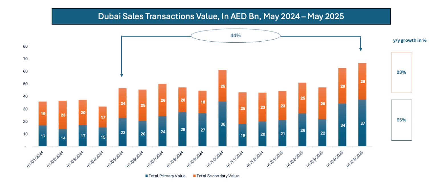 تظهر هذه الأرقام زيادة في المبيعات بنسبة 6٪ عن حجم مبيعات أبريل وزيادة بنسبة 44٪ على أساس سنوي (YoY). وقد غذى هذا الارتفاع نشاط السوق الأولي والثانوي. ارتفعت المعاملات الأولية الجاهزة أربع مرات لتصل إلى 17.9 مليار درهم إماراتي (about 4.88 دولار أمريكيB) عبر 2,400 صفقة على أساس سنوي. يمثل هذا ارتفاعا بنسبة 314٪ في القيمة وزيادة بنسبة 145٪ في الحجم