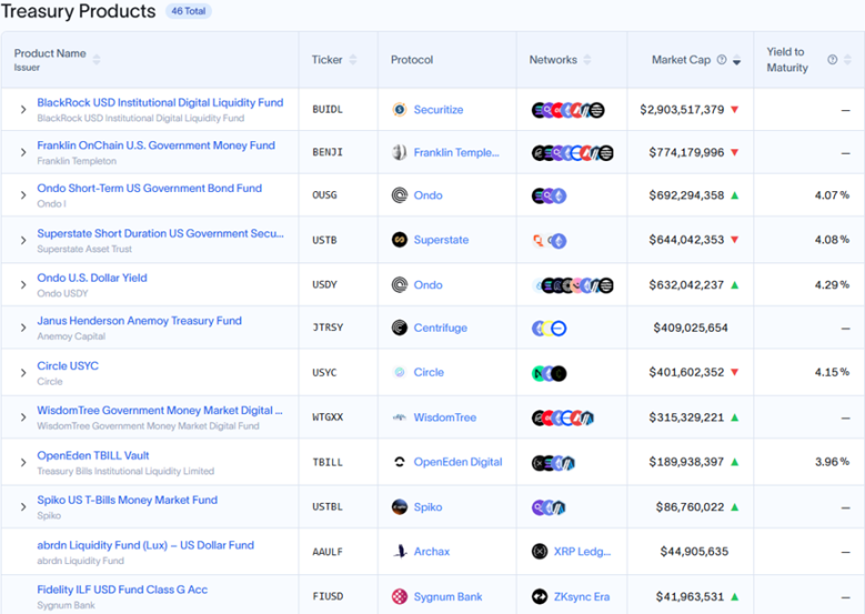 السندات الحكومية الأمريكية هي فئة الأصول الثانية من حيث حصة سوق RWA، حيث تتمثل منطق تشغيل هذا النوع من RWA في تحويل الأصول المقومة بالدولار مثل السندات الحكومية الأمريكية والنقد واتفاقيات إعادة الشراء إلى رموز رقمية باستخدام تقنية البلوكشين. في مجال السندات الحكومية الأمريكية، فإن أكبر إصدار هو BUIDL الذي أصدرته بلاك روك، حيث يبلغ إجمالي الإصدار الحالي حوالي 2.9 مليار دولار.