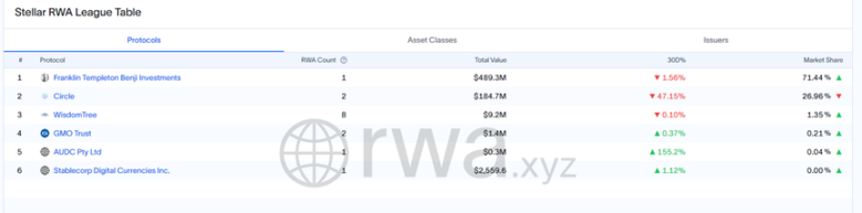 بالإضافة إلى ذلك، فإن Stellar هو الشبكة الثالثة في سوق RWA، وهو أمر يعتبر مفاجئاً. حالياً، يبلغ حجم إصدار أصول RWA على هذه الشبكة حوالي 498 مليون دولار، حيث أن BENJI الذي أصدرته Franklin Templeton حوالي 489 مليون دولار أصبح القوة الرئيسية. BENJI هو أيضاً صندوق نقدي قائم على السندات الأمريكية، حيث يبلغ حجم الإصدار الإجمالي حوالي 770 مليون دولار، من بينها 63% تم إصدارها على سلسلة Stellar.