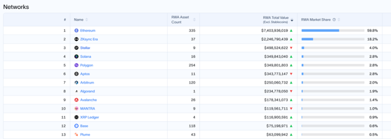 في مقارنة الشبكات العامة، لا تزال الإيثيريوم هي الشبكة الأكثر تفضيلاً لأصول RWA. حاليًا، تمثل القيمة السوقية البالغة 74 مليار دولار نسبة 55% (هنا يجب الإشارة إلى أن هذه النسبة تتعلق بجميع الأصول المصدرة على الشبكة العامة والتي تبلغ حوالي 125.5 مليار دولار، مثل الأصول التي تصدر على شبكة خاصة لم يتم حسابها).