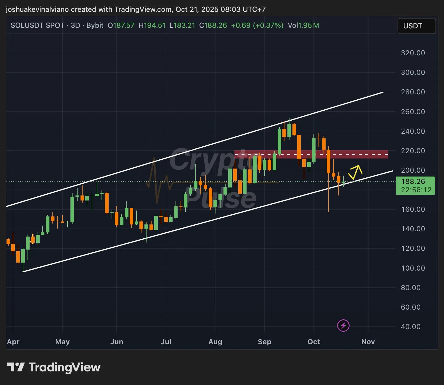 حددت منصة التحليل الفني CryptoPulse حركة سعر SOL الحالية كإعادة اختبار لخط الاتجاه الصاعد الطويل الأمد بالقرب من $185. لقد قدم هذا الخط دعمًا عدة مرات على مدار الأشهر القليلة الماضية، حيث أطلق كل مرة انتعاشات نحو مستويات مقاومة أعلى. تعطي اتساق هذه النمط الثيران الثقة في أن $185 يمثل تراكم طلب قوي.
