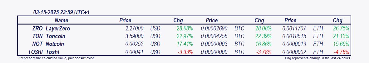 أهم المحركات اليوم هي LayerZero و Toncoin التي ارتفعت بنسبة 22.17٪ منذ الصباح. LayerZero أقل بنسبة 0.25٪.