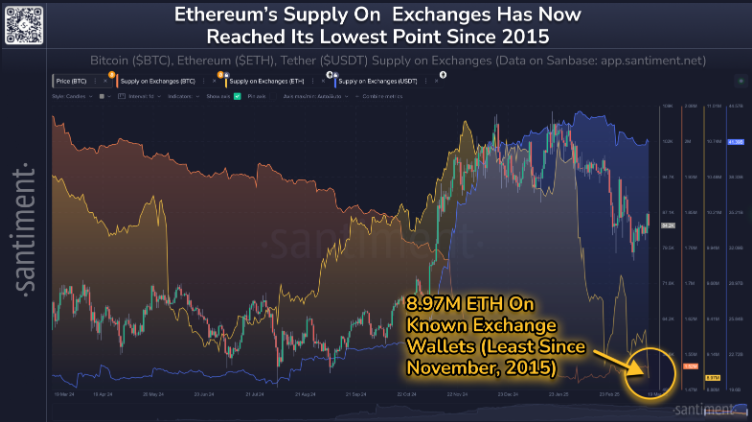 في ظل الانخفاض المستمر في سعر Ethereum’s (ETH)، استغل الحيتان والمستثمرون على المدى الطويل الفرصة لشراء الانخفاض. في 21 مارس 2025، أفادت شركة تحليلات البيانات على السلسلة Santiment أنه خلال فترة الانخفاض في السعر، قام عشاق العملات المشفرة بتجميع رموز ETH بشكل ملحوظ، مما ترك فقط 8.97 مليون ETH على المنصات، مما يشير إلى اتجاه صعودي.