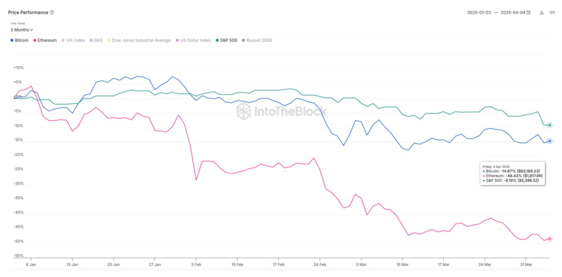 مرت إيثريوم وبيتكوين بمسارات مختلفة تمامًا في الربع الأول من عام 2025، وكانت الفجوة بينهما واضحة للغاية. وفقًا لبيانات من شركة التحليلات على السلسلة IntoTheBlock، كانت إيثريوم أداؤها ضعيفًا بشكل ملحوظ، حيث انخفضت قيمتها بنحو 50% خلال الأشهر الثلاثة الماضية.
