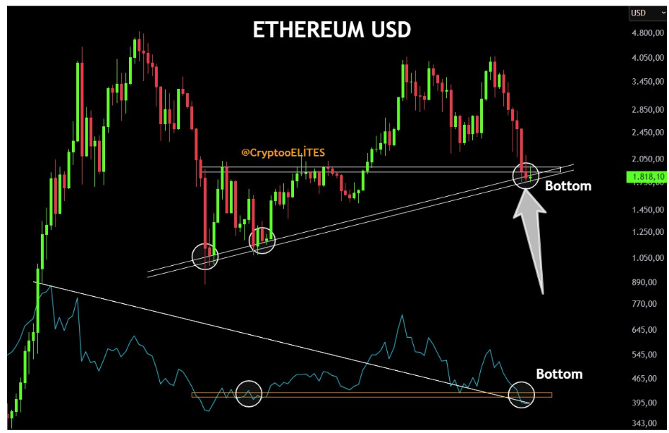 ومع ذلك، لا يزال العديد من محللي العملات المشفرة متفائلين بشأن إيثريوم ويراقبون انتعاشًا حيث إنه يقترب الآن من القاع حول 1,800 دولار. وفقًا لمحلل العملات المشفرة (@CryptoELlTES ) على منصة التواصل الاجتماعي X، فإن إيثريوم عند 1,800 دولار هو القاع.