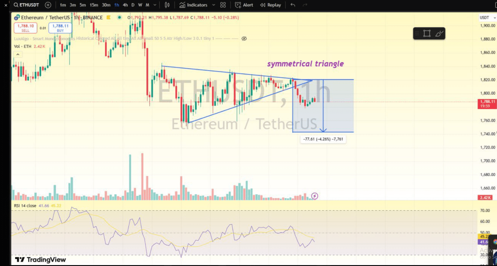 لاحظ خبير العملات المشفرة “بيت بول” مؤخرًا على إكس أن إيثريوم قد خرجت من مثلث متماثل بعد أن تراجعت إلى ما دون 1,820 دولارًا. عادةً ما تعني هذه النوعية من الانهيارات شعورًا سلبياً في الأسواق، مما يعني غالبًا استمرار الحركة السعرية النزولية.