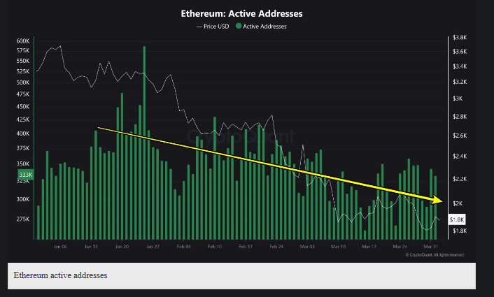 الحجة السلبية ليست فقط في هياكل الرسوم البيانية. تكشف إحصائيات السلسلة أيضًا عن نظرة سلبية لآفاق إيثيريوم على المدى القريب. لقد انخفضت العناوين النشطة لإيثيريوم بشكل كبير في الأشهر القليلة الماضية، متماشية مع انخفاض السعر.