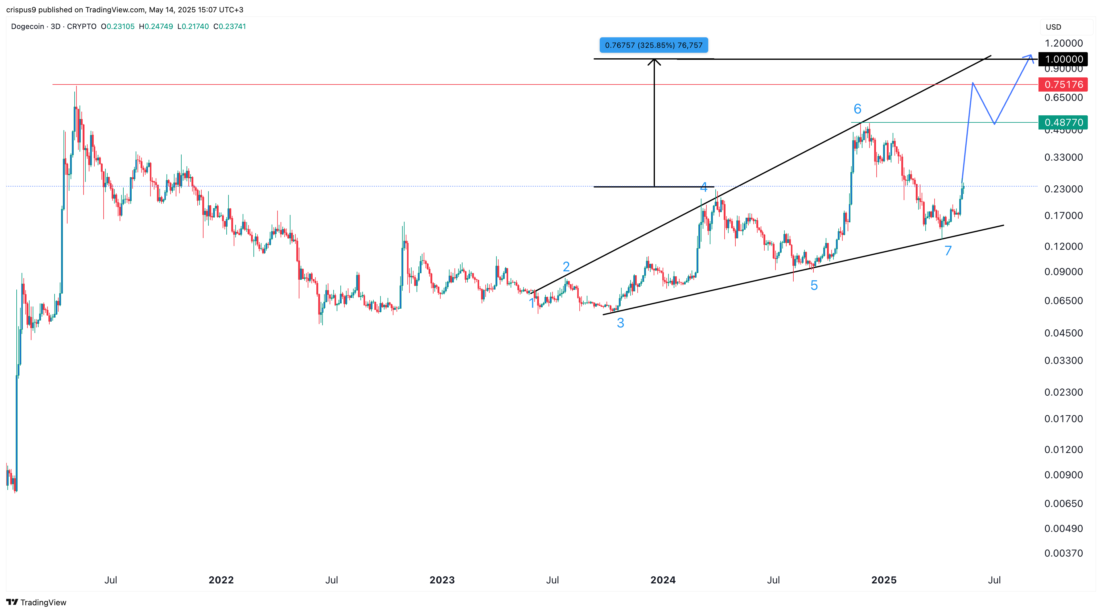 عملة Dogecoin (DOGE)، أكبر عملة ميم في صناعة العملات المشفرة، ارتفعت إلى 0.2357 دولار يوم الأربعاء، بزيادة تقارب 80% عن أدنى نقطة لها في أبريل. وقد أدى هذا الانتعاش إلى تكهنات بأنها قد تقفز إلى 1 دولار خلال هذه الدورة.