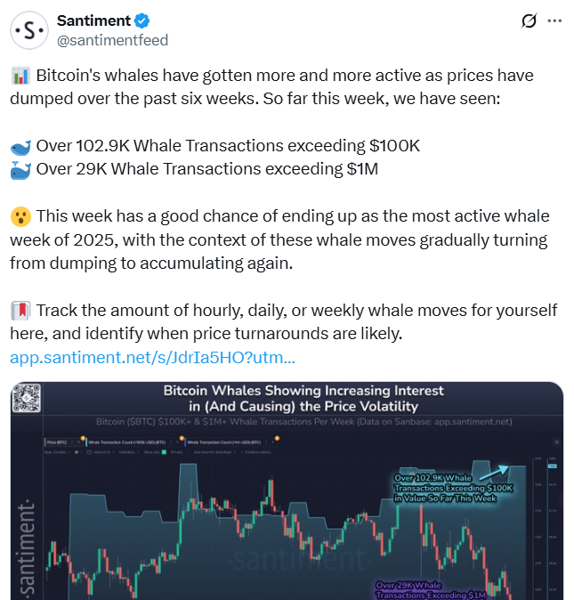 انخفضت عملة البيتكوين (BTC) إلى أقل من 90,000 دولار هذا الأسبوع — للمرة الأولى منذ سبعة أشهر. قالت سانتيمينت إنها قد تتبعت بالفعل أكثر من 102,000 معاملة للحيتان تتجاوز 100,000 دولار، و29,000 معاملة أخرى تتجاوز $1 مليون.