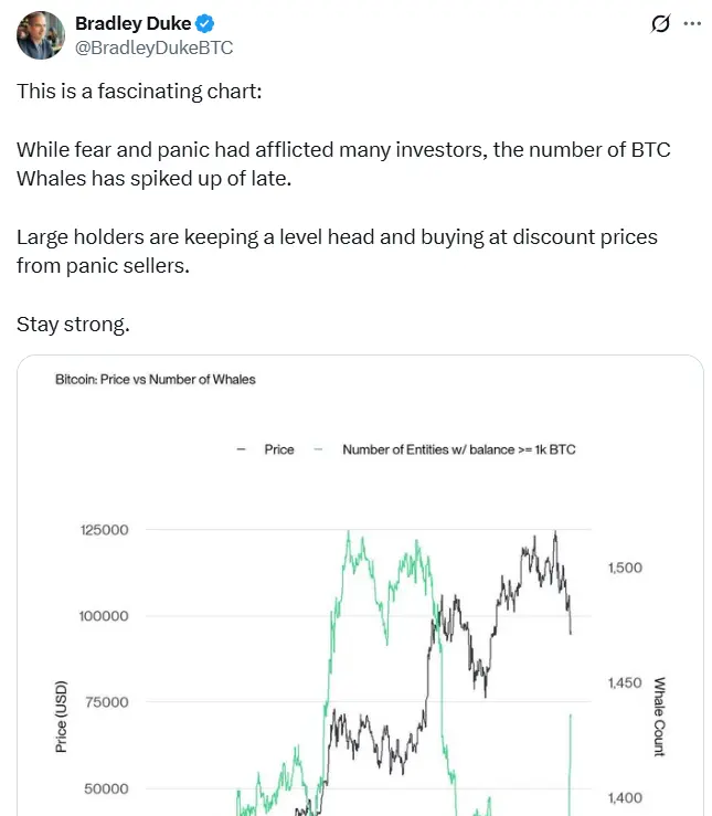 قال برادلي ديوك، المدير الإداري ورئيس إدارة الأصول في Bitwise في أوروبا، إن شركته قد لاحظت أنه مع سيطرة الخوف والذعر على السوق، بدأ الحيتان في شراء الانخفاض.