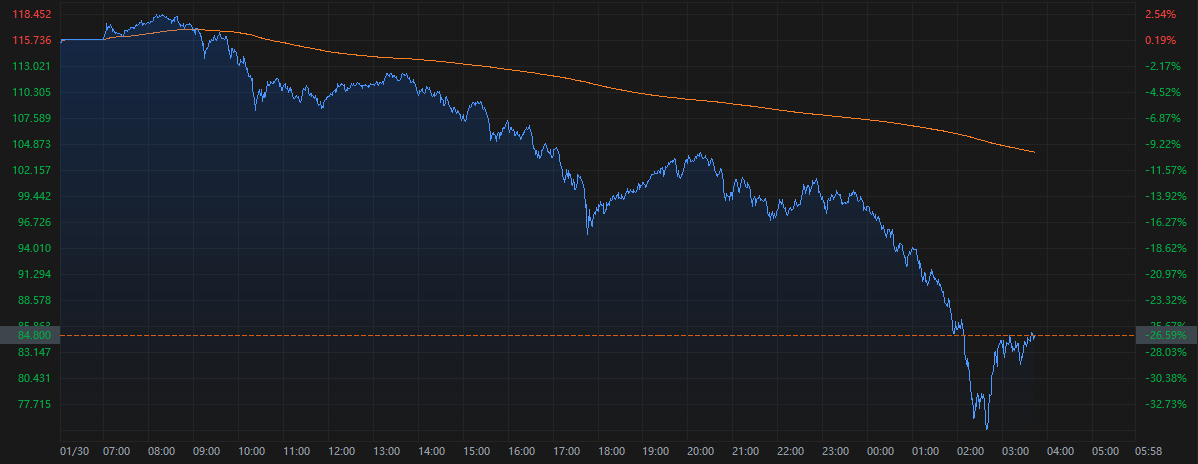 وتوضح البيانات أن سعر الفضة الفورية بدأ يتسارع في الانخفاض منذ الساعة 23:00 بتوقيت بكين، حيث انخفض حوالي الساعة 02:40 إلى أدنى مستوى خلال الجلسة عند 74.31 دولار للأونصة، مسجلاً انخفاضًا يزيد عن 36% في أقصاه. وحتى وقت النشر، بلغ سعر الفضة 85.8 دولار، مع تقليل نسبة الانخفاض إلى حوالي 26%.