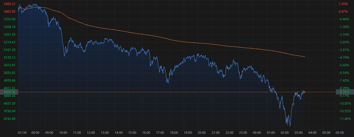 كما انخفض سعر الذهب الفوري تقريبًا في نفس الوقت إلى أدنى مستوى خلال اليوم عند 4683.04 دولار للأونصة، مع ارتفاع الانخفاض إلى أكثر من 12% في أقصاه. وحتى وقت النشر، بلغ سعر الذهب 4906 دولارات، مع تقليل نسبة الانخفاض إلى حوالي 8.8%.