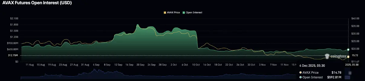 Avalanche (AVAX) se mantiene temporalmente alrededor del nivel de 14,00 USD este jueves, tras dos días consecutivos de recuperación. Sin embargo, el interés abierto (OI) en los futuros de AVAX sigue mayormente lateral por debajo de los 600 millones de USD, reflejando que el sentimiento de cautela aún predomina entre los inversores.