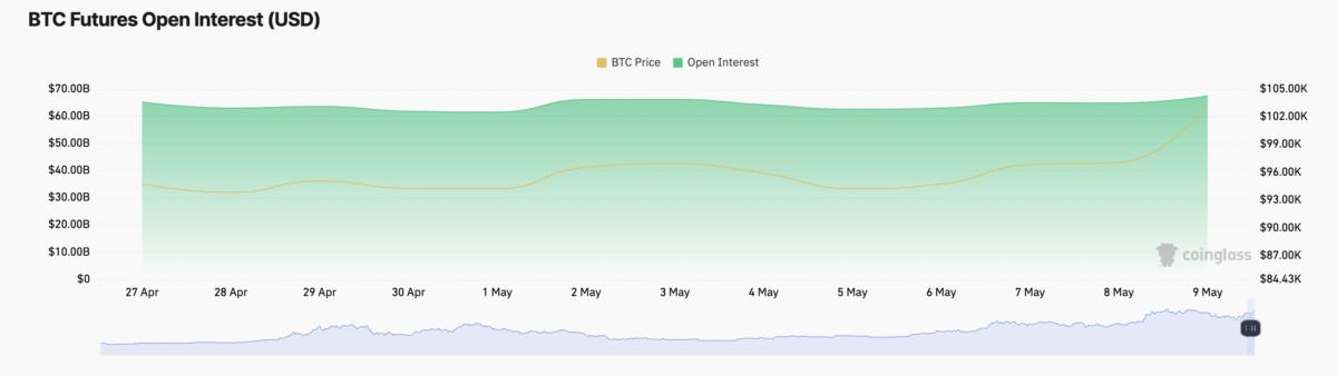 El interés abierto en el mercado de futuros en el momento de escribir es de $67,45 mil millones, aumentando un 5% en el último día. Cuando el interés abierto de un activo crece junto con su precio, esto indica la entrada de nuevo dinero al mercado, lo que sugiere un fuerte impulso alcista.