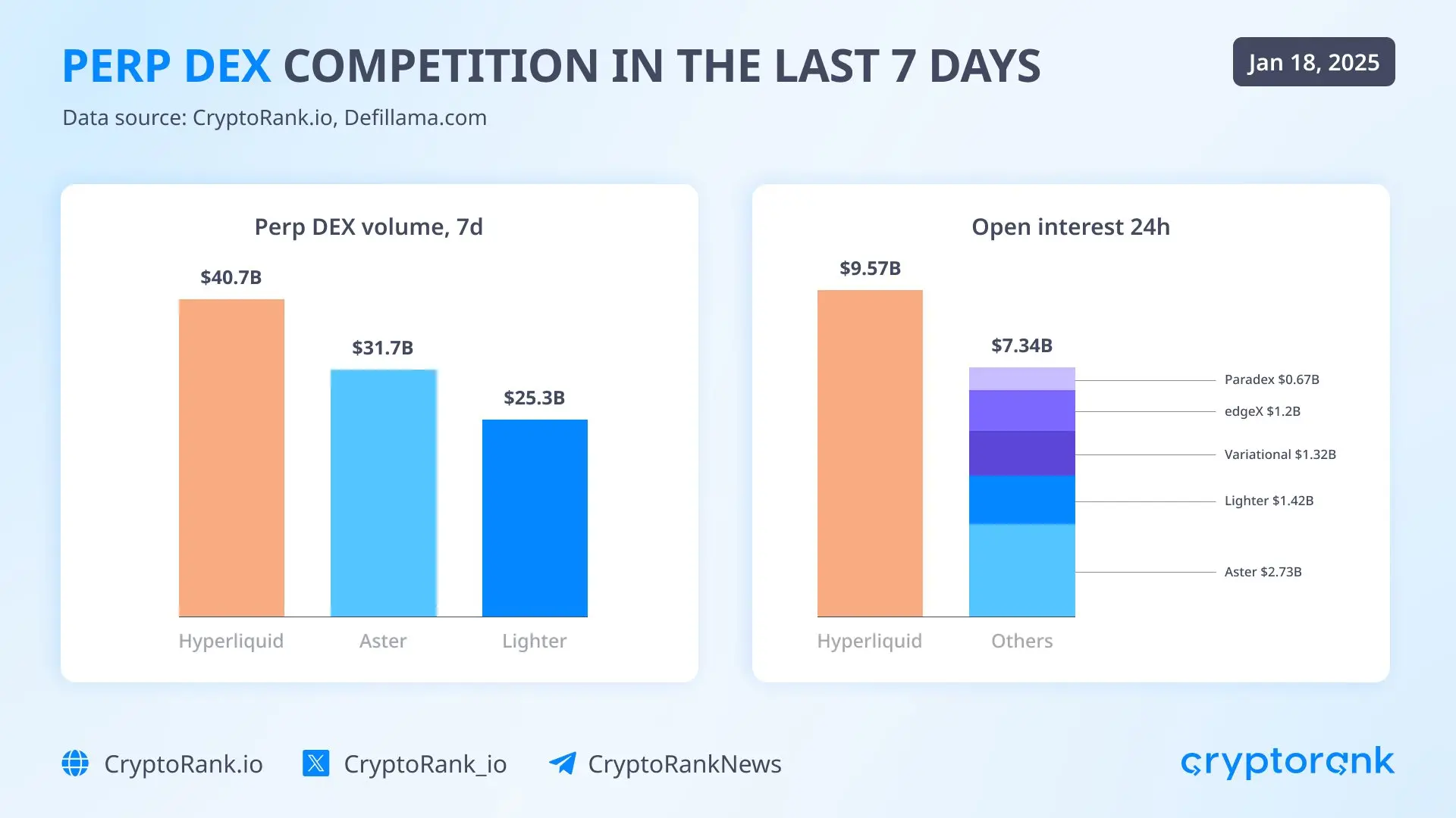 Según datos de CryptoRank, hasta el 18 de enero, Hyperliquid alcanzó un volumen de operaciones de 40.7 mil millones de dólares en los últimos 7 días, y contratos sin cerrar en 9.57 mil millones de dólares en 24 horas, ocupando el primer lugar en ambas métricas. Los competidores Aster y Lighter registraron volúmenes de 31.7 mil millones y 25.3 mil millones de dólares en 7 días, respectivamente.