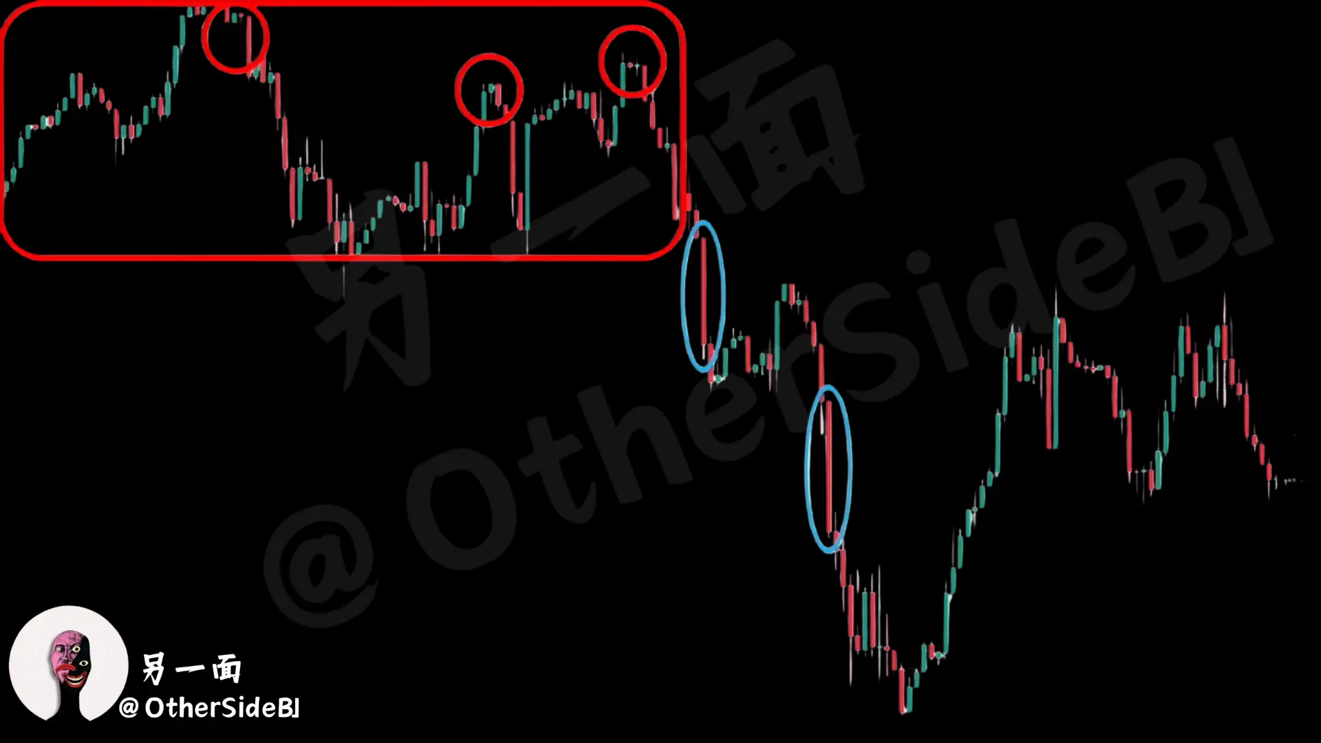 ! Regardons la Figure 2 Les deux grandes lignes de yin encerclées en bleu sont très représentatives, surtout celle ci-dessus, Vous voyez, tout le marché avant l’apparition de la grande ligne noire était en réalité en phase de consolidation par choc, les forces longues et courtes étaient sciées à plusieurs reprises, et le prix n’a jamais franchi le sommet précédent, et il y avait un état d’attaque haussière faible. Alors que cette phase touchait à sa fin, une très longue bougie noire est soudainement apparue, brisant instantanément l’équilibre initial, les haussiers ont complètement perdu leur initiative, et le prix a été fortement réprimé par les baissiers. Quant à cette ligne négative, elle a non seulement mis fin au schéma de choc initial, mais est aussi devenue le point de départ pour accélérer le déclin du marché. Si vous regardez la tendance qui suit, le prix est descendu complètement, sortant de nombreuses lignes négatives d’affilée, et est complètement entré dans une tendance baissière. La large ligne noire en bas du chiffre apparaît dans la tendance baissière claire et correspond à la période d’accélération de la libération continue de la dynamique baissière, consolidant davantage la tendance baissière.