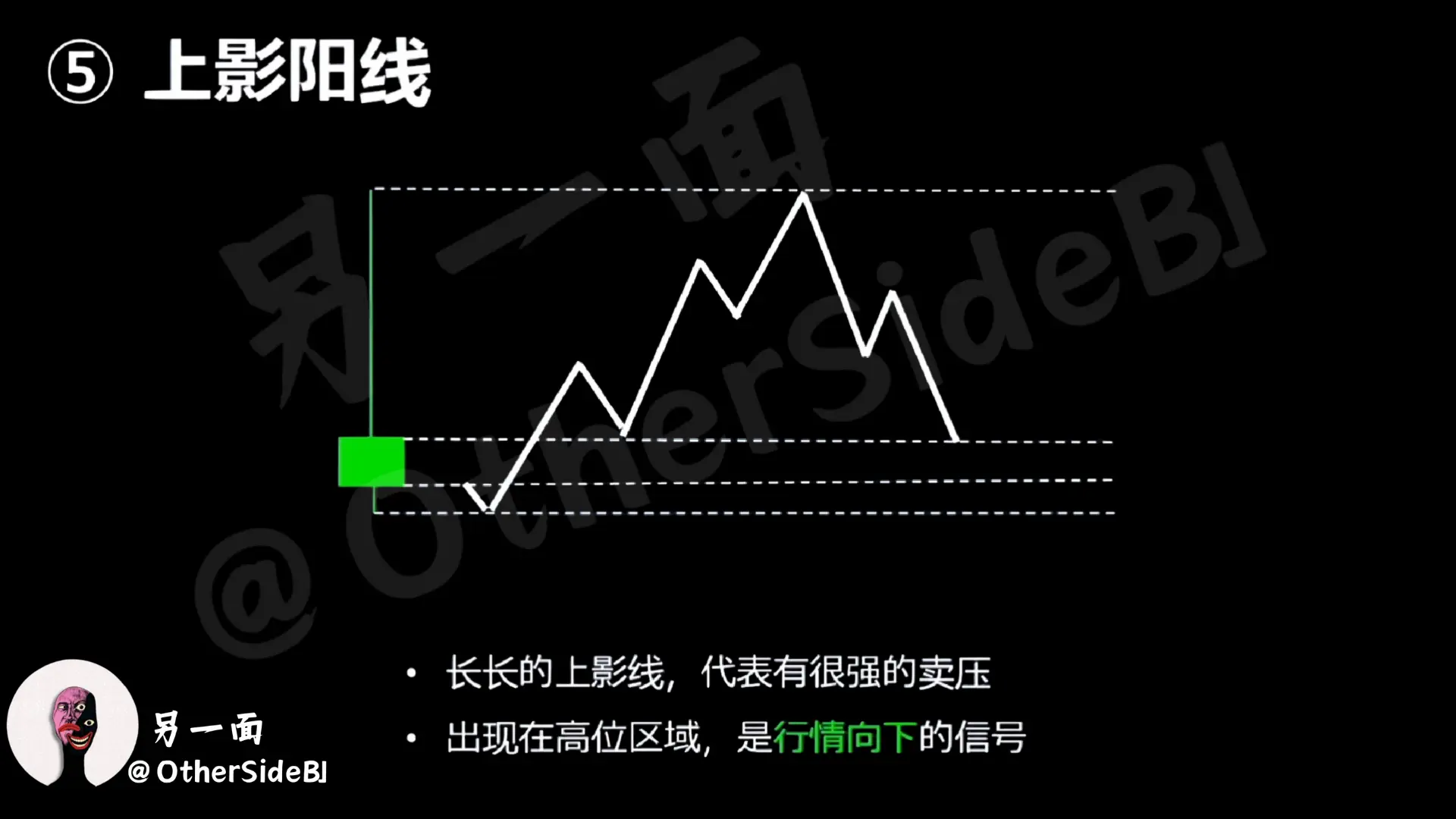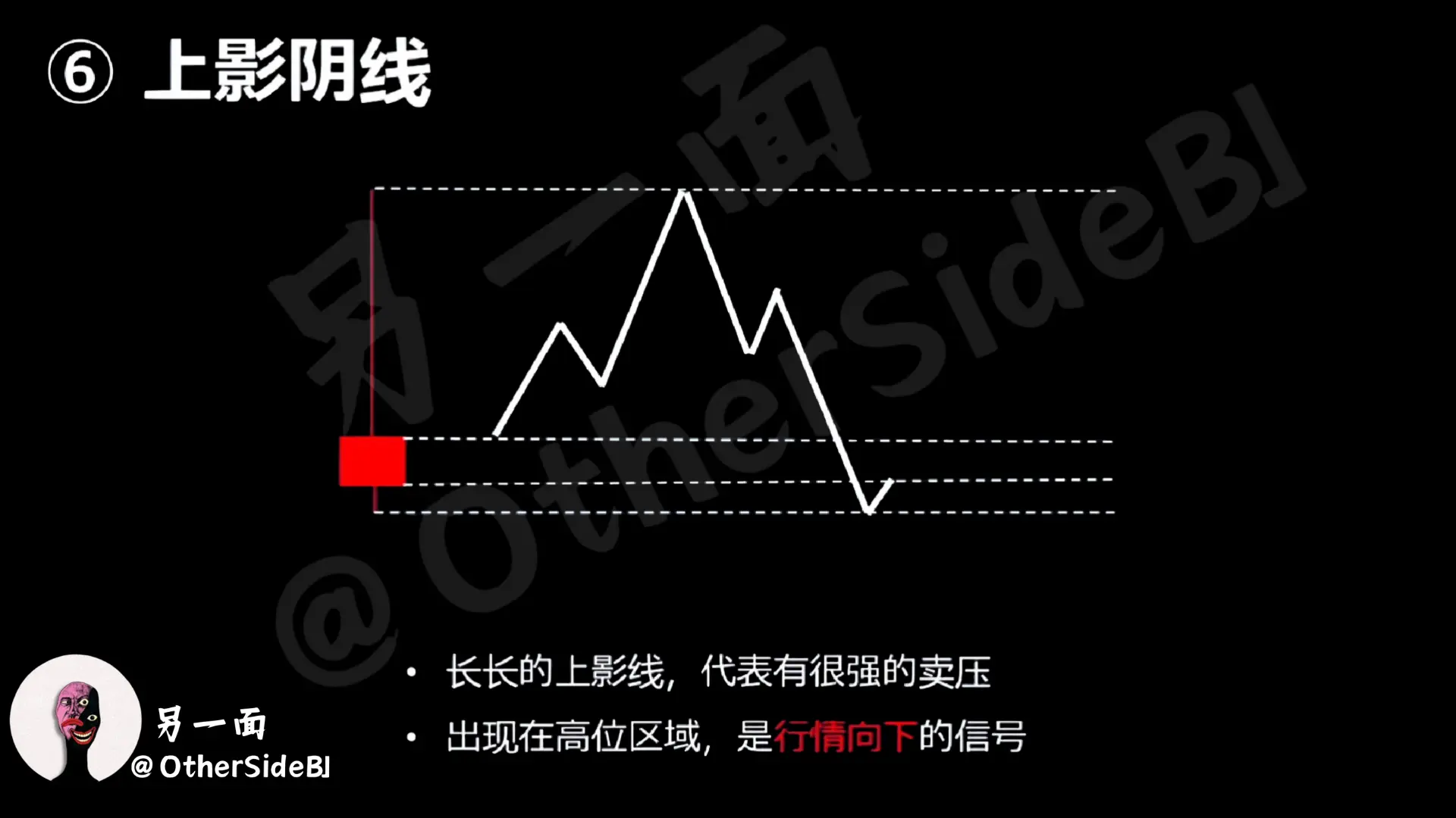 Quel genre de chandelier est-ce ? C’est une bougie positive avec une longue ombre supérieure. On peut aussi voir dans la tendance du prix que le prix a augmenté au début, mais qu’il a ensuite été réprimé par la force, laissant une longue ombre. Alors, qu’est-ce que cela signifie ? Cela montre qu’une forte pression vendeuse a freiné le rallye initial, donc si ce type de chandelier positif apparaît dans la zone du haut, cela peut indiquer qu’il passera de la hausse à la baisse.