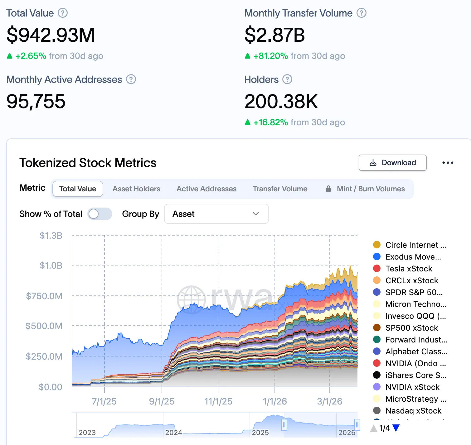 La valeur totale des titres RWA a atteint 942 M$ — sur un mois, la valeur a augmenté de 2,65%.