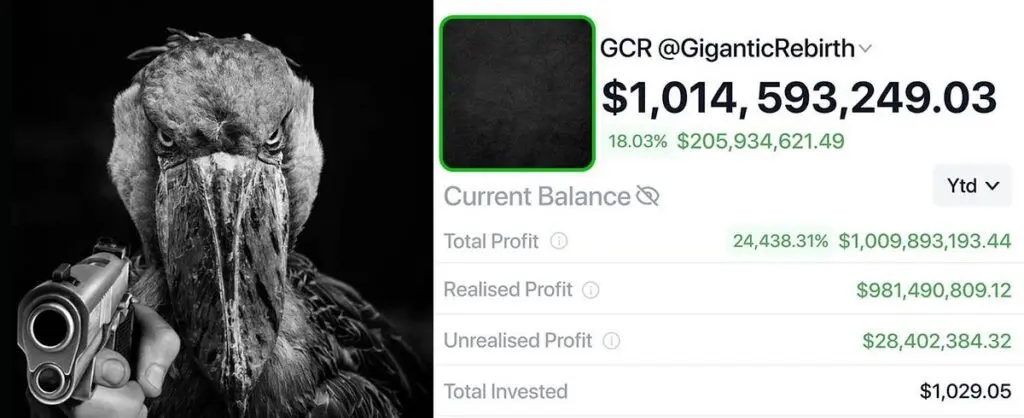 GCR adalah seorang trader semi-anonim yang dikenal karena keyakinannya yang kuat dan sering kali bertentangan dengan konsensus pasar (. GCR menarik perhatian global karena berhasil menjual LUNA secara pendek ) termasuk (juta$10 tepat sebelum kejatuhannya. Sejak saat itu, ia dikenal karena menggabungkan altcoin yang berisiko dengan ketajaman dalam membaca pergeseran makro.
