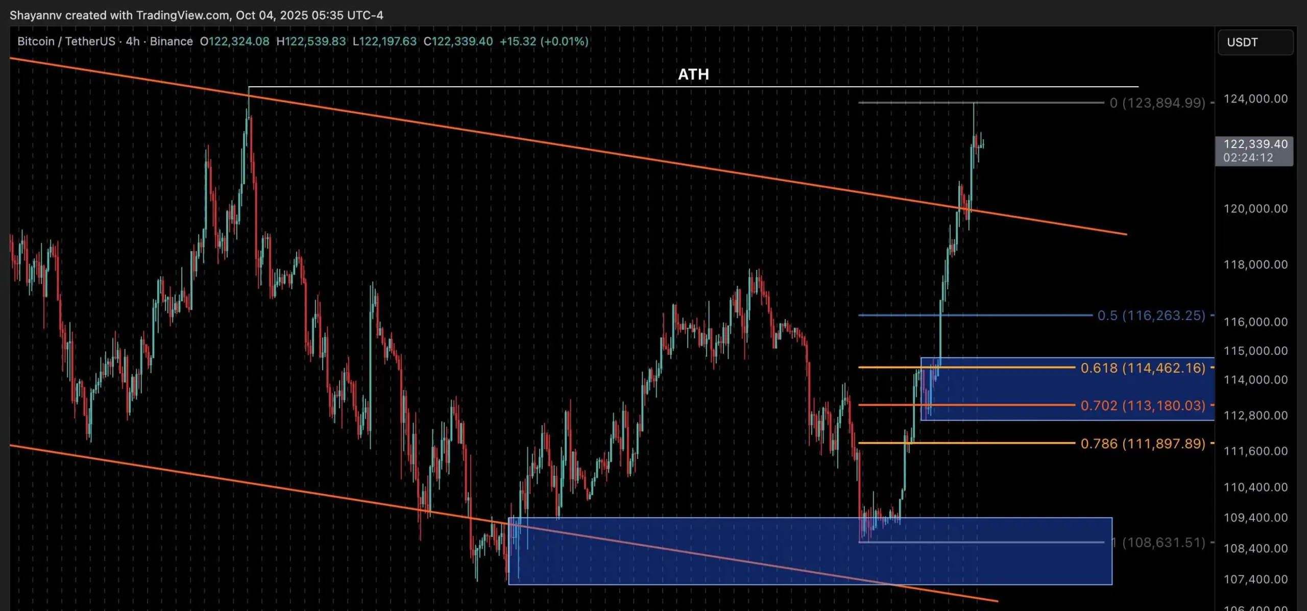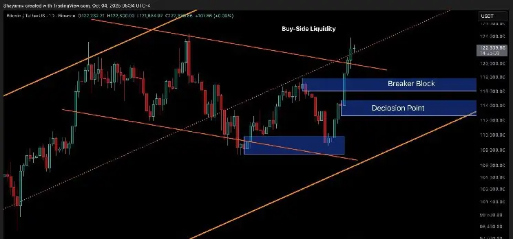 Bitcoin telah memperpanjang reli setelah breakout bersih dari saluran menurun, merebut kembali level struktural utama dan bergerak menuju $122K--$124K tertinggi sepanjang masa.