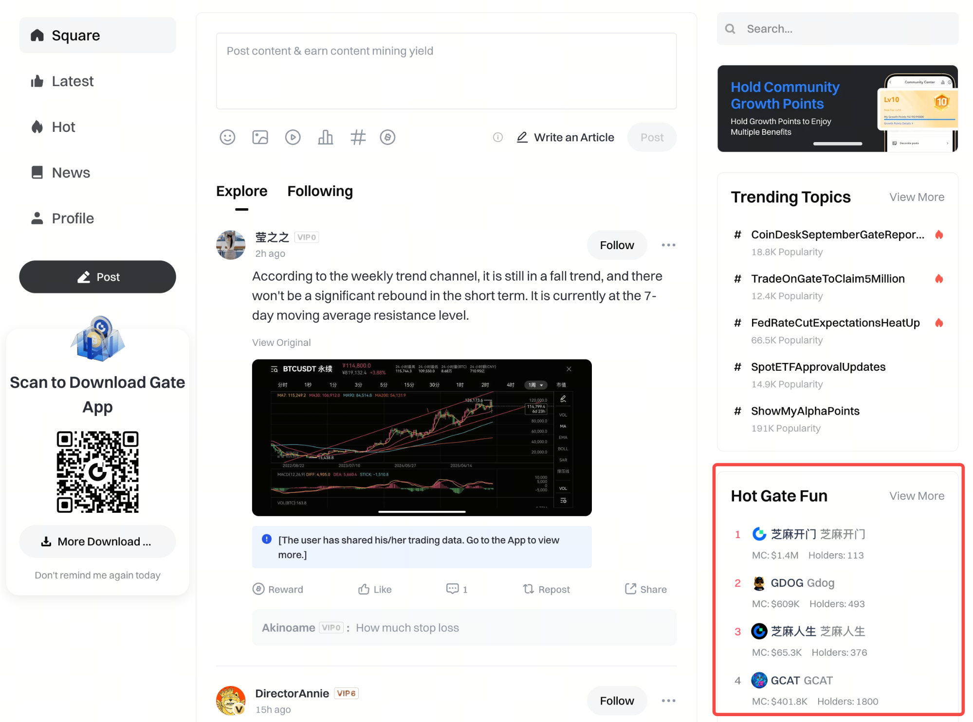 2. Gateウェブ公式サイトの「ホットGate Fun」セクションにある「スクエア」から、トークンをクリックして該当コミュニティへアクセスする。