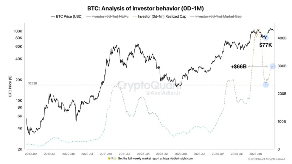 記事によると、BTCの短期的な動向は今週決定されると予想されています。多くの買い手が一時的に市場を取り戻して成功していますが、世界的な緊張状況やマクロ経済の逆風により、不確実性は依然として高いです。CryptoQuantのオンチェーンデータは現在の市場動向をさらに洞察しています。4月中旬以来、0-1か月の実現時価総額は660億ドル増加しました。