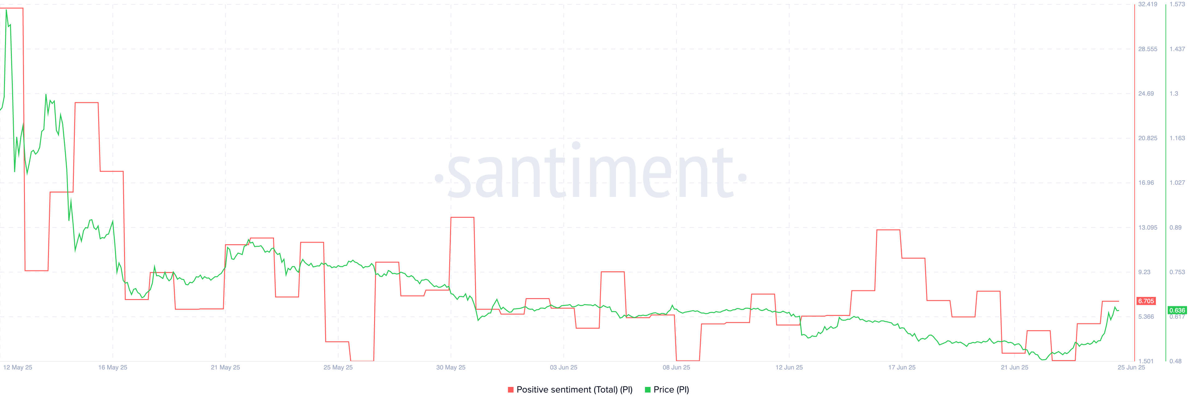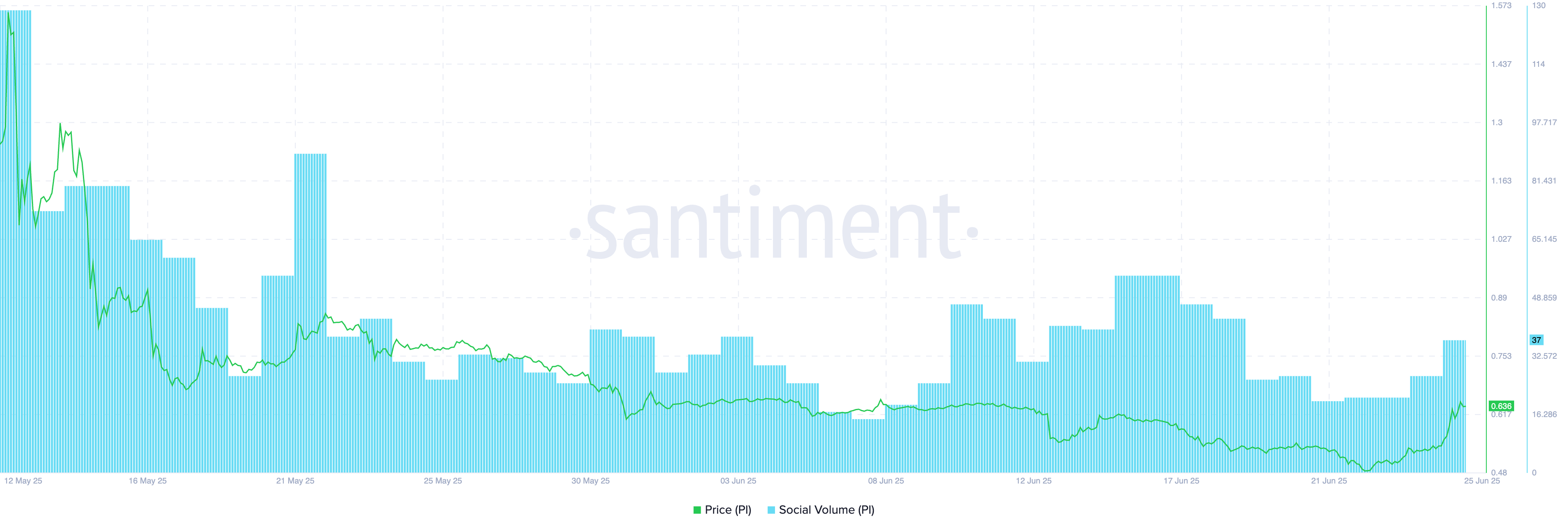 Santimentのデータによれば、PIはXやTelegram、Redditなどのソーシャルプラットフォームでの言及率が上昇しています。下のソーシャルボリュームのグラフに基づくと、今週のPIの議論量は安定しています。