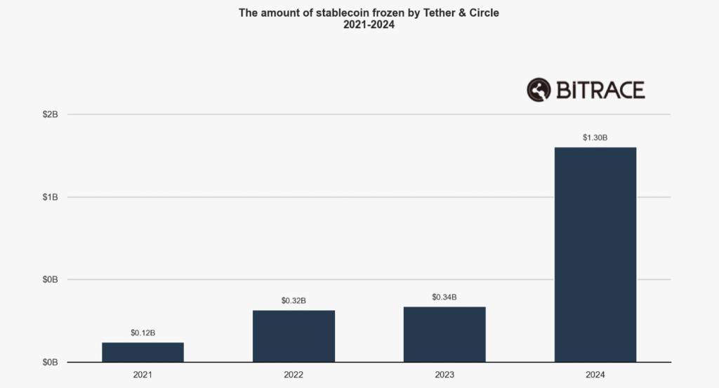 2024年、TetherとCircleの発行体は合計で13億ドル以上を凍結しましたが、これは過去3年間の2倍に相当します。このようなアドレスでの全取引量は129億ドルに達しました。スニモク-エクラナ-2025-04-29-171718