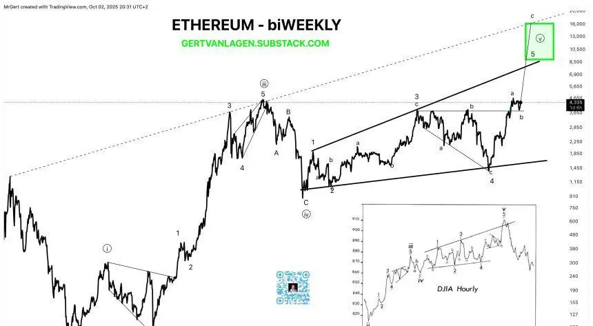 エリオット波動理論は、市場価格の動きを波のサイクルの形で見るテクニカル分析の手法であり、強気のトレンドは通常、5つのインパルス波の後に3つの調整波が続くとされます。一部の上級テクニカルアナリストは、イーサリアムが主要な調整波を完了し、現在は波Vまたは最後のインパルス波を開始する準備が整っていると考えています。この分析は、現在のETH価格の急騰が波Vのサブ波Cを形成していることを示しています。サブ波Aは、$3,650周辺の重要な抵抗を突破することに成功し、サブ波Bで短期間の調整の後、市場は現在サブ波Cの最終的な推進に向けて準備が整っています。$5,000近くの前回のATHを上回ることは非常に重要とされており、これは主要な心理的抵抗を取り除き、この最後のインパルス波の開始を確認するものとなります。