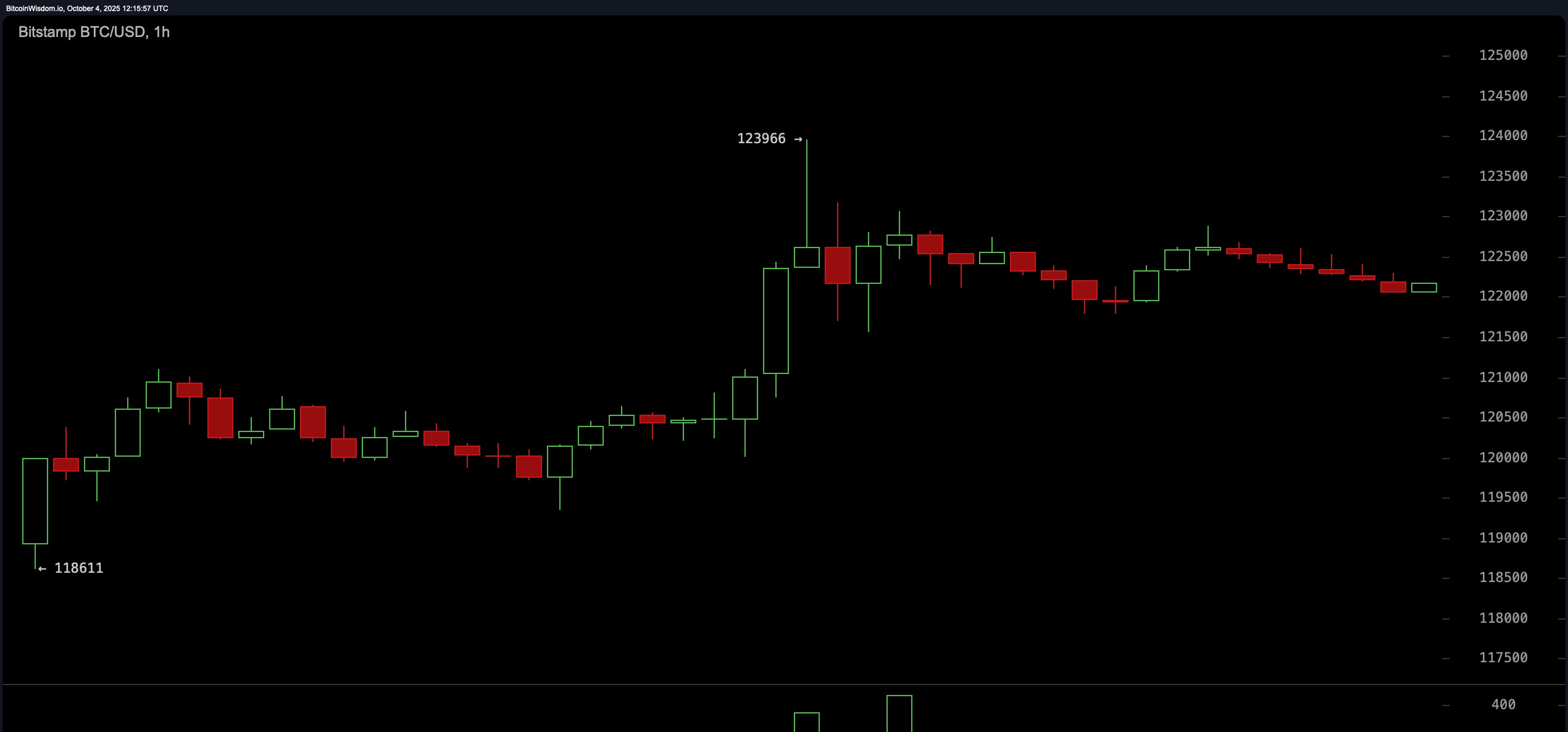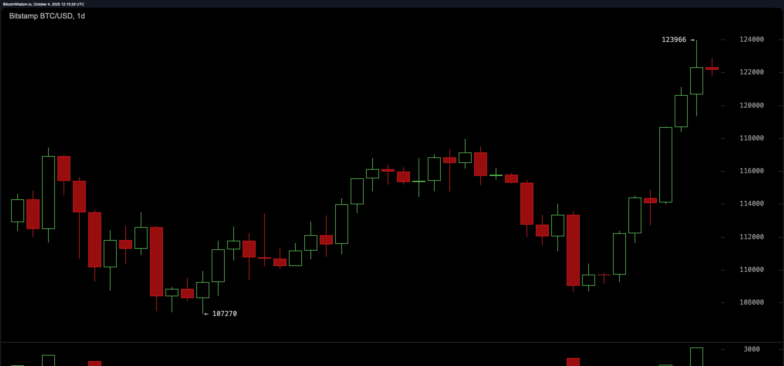 **もしめまいを感じているなら、それは単に高度のせいです---ビットコインは$122,087で高く飛んでおり、六桁クラブに大胆な主張をしています。しかし、月を目指す前に、一息ついてください---この価格の動きは強調されているかもしれませんが、チャートは異なる物語をささやいています。**# ビットコインチャートの見通しと価格予測日足チャートから始めましょう。ビットコイン(BTC)は、$110,000からほぼ$124,000に市場を所有するかのように堂々と上昇しました---なぜなら、実際にそうだからです。その12.6%の急上昇はボリュームの力を伴い、ブルたちが本気であることを確認しました。それでも、相対力指数(RSI)が69に、ストキャスティクスが91という高値で停滞しているため、買われすぎの領域は非常に快適に見えます。商品チャネル指数(CCI)が170で警告を発し、モメンタムオシレーターは8,842で手を挙げ---赤信号を点灯させました。そして、移動平均収束発散(MACD)は強いモメンタムシグナルで反撃したので、モメンタム愛好者たちはまだしがみつく希望を持っています。2025年10月4日のBTC/USD 1日チャート。4時間足のチャートでは、ビットコインの上昇トレンドが教科書通り---高値更新、高値更新、そして$123,966の抵抗線直下での価格のダンスが見られます。しかし、その優雅な形に騙されないでください。ボリュームはすでにピークに達し、私たちを幽霊のように離れ始めています---ブルが息切れしている可能性を示す古典的な兆候です。価格が$122,000での支持を失った場合、$118,000--$119,000のサポートゾーンへ滑り落ちる準備をしてください。このレベルは現在の月曜日の朝におけるカフェインのように重要です。2025年10月4日のBTC/USD 4時間足チャート。1時間足のチャートにズームインすると、雰囲気はパワースーツからパジャマパンツにシフトします---横ばいの統合と弱さの気配。小さなボディのキャンドルと赤いバーは決断のなさを示し、消えゆくボリュームはブルがチャットを離れたことを叫んでいます。価格が$121,800を下回ると、事態は急変する可能性があり、$120,000や$118,500が潜在的なキャッチゾーンの役割を果たすことになります。今のところ、マイクロトレンドは控えめな呟きであり、大胆な宣言ではありません。BTC/USD 2025年10月4日の1時間足チャート。オシレーター信号は混合感情のカクテルです。RSI、ストキャスティクス、平均方向性指数(ADX)、およびオーサムオシレーターはすべて「中立」領域にあり、ビットコインが気分を選ぶのを待っているようです。唯一MACDがポジティブなパルスを点滅させる勇気を持っていますが、モメンタムとCCIはそれぞれベアリッシュなラインを引いています。FOMOと注意の間でのダンス---それに応じて賭けをしてください。その間、すべての移動平均---10期間の指数移動平均(EMA)から200期間の単純移動平均(SMA)まで---が緑色に点灯しています。これは、数えている人にとっては12の別々のモメンタム確認であり、トレンドフォロワーからの明確な信任の表れです。しかし、ここでのポイントは、我々はノーマンズランドにいるということです。価格は高値からわずかに離れており、近くの強いレベルに裏付けられていません。したがって、ただのアドレナリンで取引していない限り、クリーンなブレイクアウトか、満足のいくディップを待ってから再参戦するのが良い時期かもしれません。### ブルバージェクト:モメンタムは冷却しているかもしれませんが、トレンドは常にあなたの最良の友人です---そして今、ビットコインのトレンドは明らかに強気です。すべての主要な移動平均が「買い」を示しており、主要なサポートの崩壊も見当たらないため、これは別の上昇の前の一時停止かもしれません。価格が118,000ドルを上回っている限り、ブルは依然としてフィールドを支配しています。### ベアの判決:期待と高額な価格にもかかわらず、警告サインが積み上がっています。オシレーターは注意を示し、モメンタムは失われ、価格は抵抗線付近で停滞しています。もしビットコインが$122,000を下回り、それに伴うボリュームがあれば、$118,000---あるいはそれ以下---への急落が速く、鋭いものになる可能性があります。
