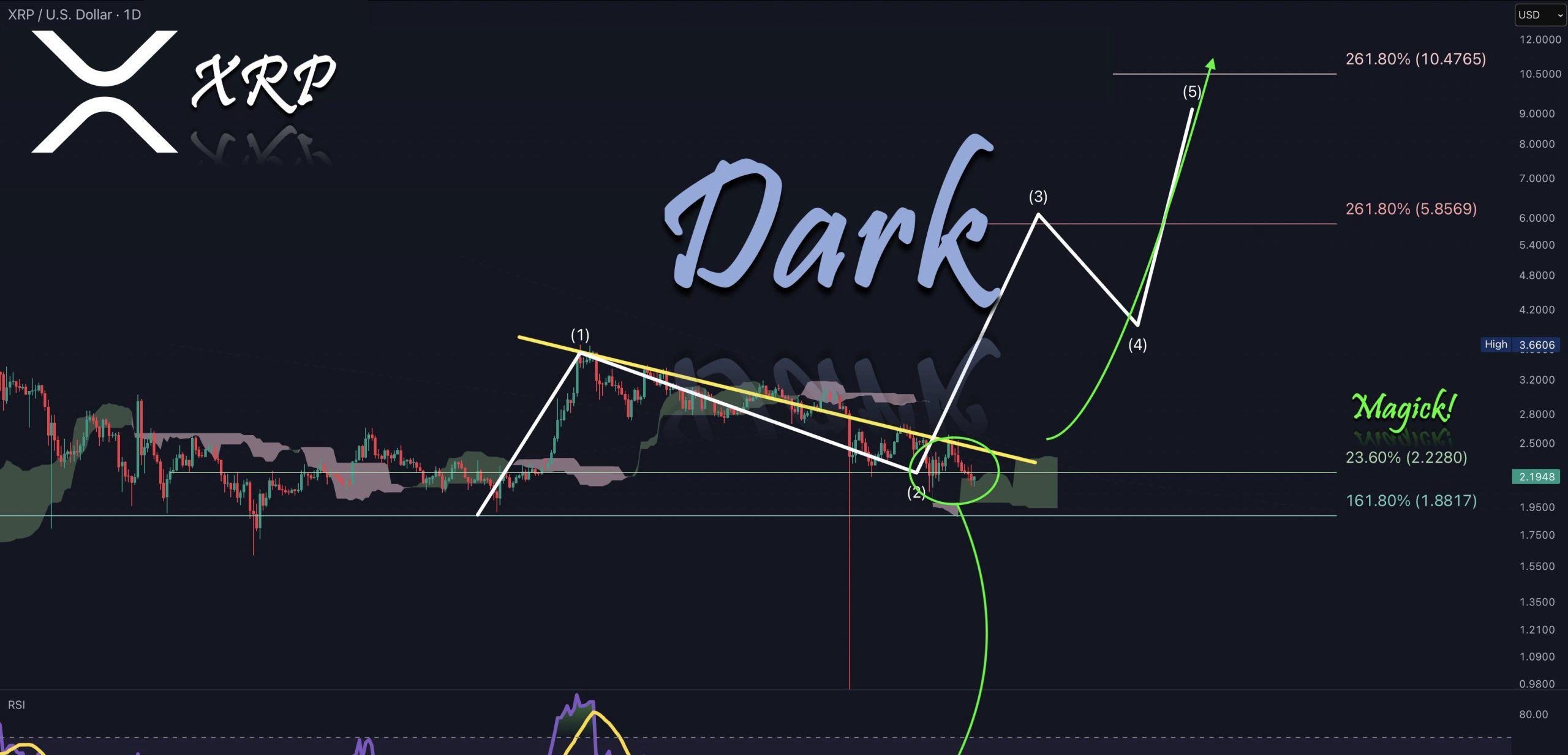 ソース: ETHNewsオリジナルタイトル: XRP: アナリストが爆発的なマルチウェーブラリーを$5.85および$18.22に向けて予測: その理由はこれだオリジナルリンク: XRPの価格動向は、著名なアナリストであるダーク・ディフェンダーが再登場し、大胆な見通しを示した後、再び注目を集めています。彼は、$2.2周辺の新たに確認されたサポートゾーンを強調しながら、長年の強気なシナリオを強化しています。彼の最新の更新は、長期保有者向けの感情的なメッセージと、次の主要サイクルでの二桁のXRPを示す詳細なエリオット波動のロードマップを組み合わせています。## 長期保有者へのメッセージダーク・ディフェンダーは、XRPの回復力が$0.11から現在の$2.2付近までの多くの価格レベルで繰り返し試されてきたと強調しました。彼のメッセージは、長期的な支持者はすべてのフェーズを通じて残っており、次の拡張フェーズでも残ることを期待しているということです。彼によれば、$2.2222を下回ることは非常に困難であり、それを「揺るぎないサポート」と表現しています。このレベルは$2.2280のフィボナッチ23.6%ゾーンと一致しており、XRPが重要な蓄積エリアに到達したという考えを強化しています。## チャート:強気のエリオット波動構造が主要なブレイクアウトを示唆ダークディフェンダーのチャートは、現在、波(2)と波(3)の間に位置するクラシックな5波エリオット波動構造を示しています。* Wave (1): 今年初めの初期インパルスレッグ。* Wave (2): $2.00~$2.20の間の狭い需要ゾーンで底を打った修正。* ウェーブ (3): XRPを$3.60以上に戻す主要な予想ブレイクアウトレッグで、新たな高値を設定するための舞台が整います。* ウェーブ (4): 急騰後の一時的な調整。* Wave (5): 爆発的な拡張波で、ターゲットはフィボナッチの投影から導出されます。**チャートは二つの主要な拡張目標を強調しています:*** 261.8% 拡張は $5.8569 で* 261.8% マクロエクステンション $10.4765ダークディフェンダーは、彼のメッセージの中で将来のチェックポイントをさらに示しました:$5.85と$18.22、これは彼の長期的なマクロフィボナッチモデルと一致しています。## RSIセットアップはモメンタム反転をサポートしますチャートのRSI指標は、レンジの底で形成されている強気のカールを伴う引き締まった統合を示しています。このタイプのRSIの挙動は、特に波(2)から波(3)への移行中に、通常、モメンタムの拡大に先行します。RSIパターンは以前のXRPのブレイクアウトを反映しており、強気の波シナリオにコンフルエンスを追加しています。## センチメント: "ダブルディジットへの道"彼のトレードマークであるモチベーショナルスタイルで、アナリストはフォロワーに、長期的な信者がすべての主要レベルを通じてXRPを維持してきたことを思い出させ、彼は彼らが10ドル台の価格への予想される上昇を通じてとどまると予想していることを伝えました。彼のメッセージは、トレーダーに「飛び込むか、話すことに溺れるか」を決めるよう挑戦しており、恐れよりも信念を強調しています。## より広い文脈XRPは最近、暗号市場全体が不安定な週を経て、重要なサポートレベルの上に安定しています。複数のアナリストがETFによる再評価効果や長期的なテクニカル構造が強気に転じる可能性について議論している中、XRPは次の暗号サイクルにおける潜在的なハイベータプレイの一つとして注目を集め続けています。Dark Defenderの最新のアップデートは、そのストーリーを強化しており、技術的なセットアップ、フィボナッチ構造、および心理的サポートゾーンがすべて、今後の大規模なマルチウェーブラリーを示唆していると主張しています。