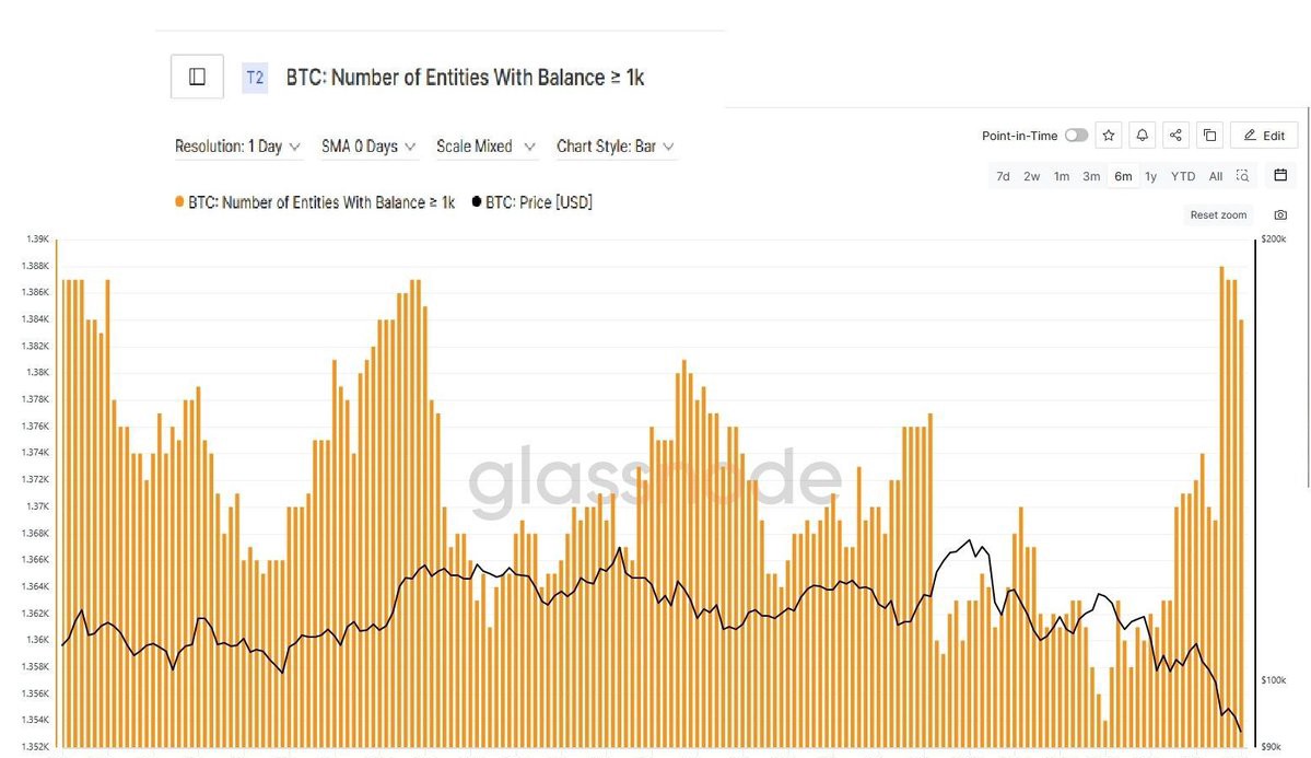 Glassnodeのデータによると、1,000 BTC以上を保有するウォレットが2.2%増加し、1,384アドレスに達しました。これは4か月ぶりの最高値です。この蓄積の急増は、ビットコインの価格が急落した時期と一致しており、"スマートマネー"の行動の典型的なサインです。