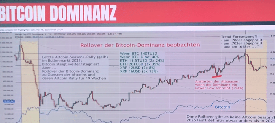 ソース: CryptoNewsNet原題: ドイツの国営テレビがXRPの低迷について語り、$16への急騰の条件を共有ドイツの主要な金融チャンネルが、進行中のビットコインとより広範な市場の下落トレンドの中で、最新のXRPの下落を最近調査しました。背景として、ビットコインが$90,000のレンジに滑り込む中、XRPは$2 地域の下限に落ちており、現在$2.13で取引されています。ある投資CEOがプログラムに参加し、ボラティリティを説明し、XRPが$12に向かう可能性があると彼が考える条件を提示しました。ホストはXRP市場の崩壊を指摘しました。彼女は、XRPが最近のスポットETFの立ち上げにもかかわらず、より広範な市場と共に動いていることを強調し、XRPがイーサリアムと類似の重要なレベルを示しているかどうか尋ねました。## XRPは通常レンジの安値から上昇しますアナリストは、彼の会社が$2 と$3の間の長期的なXRP価格帯を追跡し続けていると述べました。彼は、XRPが最近このバンドの中央に位置していたが、現在は下落の中で下側に傾いていると説明しました。彼によれば、XRPは通常、レンジの底から主要な上昇を始めるのであって、真ん中や上部からではない。その結果、彼は$2.20、$2.15、$2.10、さらには$2.00付近への短期的な下落に対しても安心感を持っていると言った。なぜなら、それらのレベルは依然として反発の余地を残しているからだ。彼は、XRPが現在その下のゾーンに漂っているが、これは強いブレイクアウトの前に見られる正常な挙動の一部であると付け加えた。## XRP ETFの見通しアナリストは次に、Canary CapitalのスポットXRP ETFを指摘しました。このETFは11月13日にローンチされ、2025年にアメリカであらゆる資産クラスの中で最も成功したETFデビューとしてすぐにランク付けされました。この商品は初日で$58 百万のボリュームを記録しました。彼は他の主要な金融機関が今後数日以内に独自のXRP ETFを立ち上げるだろうと言いました。彼はこれらの立ち上げが伝統的な金融におけるXRPの新しいフェーズの始まりを示していると信じています。アナリストは、カナリアキャピタルETFがビットコインの下落によって引き起こされた弱い市場環境にもかかわらず、印象的な数字を示したことを強調しました。彼は、ETFの勢いが強い基盤需要を示しており、利用可能な供給が引き締まると加速する可能性があると述べました。彼によれば、市場の状況が改善し、今後の刺激策が効果を発揮し始めると、XRPは急激な上昇を示す可能性があるとのことです。## XRPの$16へのランの可能性の条件一方、市場がどれほど変動的になったかを示すために、アナリストはXRPの激しい日中の変動に注目しました。彼は、XRPが前日の午後の約10分で4.5%上昇し、$2.30に達した後、次の2時間で6%下落したと指摘しました。彼はこれらの動きが自然に見えず、市場に影響を与える大規模なマーケットメーカーが関与している可能性が高いと主張しました。アナリストは、暗号通貨を取引する人はそのような変動に対処する神経を養う必要があると警告しました。彼は以前、XRPの市場シェアについてもコメントしました。彼は、XRPが現在市場の約4%を占めており、前回のアルトコインシーズンでそのシェアを3倍にしたと述べました。もしXRPが現在のシェアを単純に倍増させて8%になると、彼はそれが約12ドルで取引される必要があると考えています。しかし、XRP市場が3倍になって13%に上昇すると、XRP価格は16ドルに達する可能性があります。それでも、この価格はビットコインが1.4兆ドルに落ち、その支配率が40%に減少する場合に実現するでしょう。これはアルトコインにとって理想的な条件を生み出します。