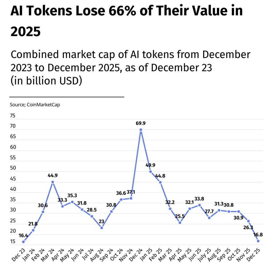 AIトークンの時価総額は、2024年12月に69.9億ドルの史上最高値に達しましたが、ニューラルネットワークへの関心の高まりによるものでした。しかし、2025年第1四半期にはムードが変わり、4月までにセクターは63%、$44 億ドルの価値を失いました。