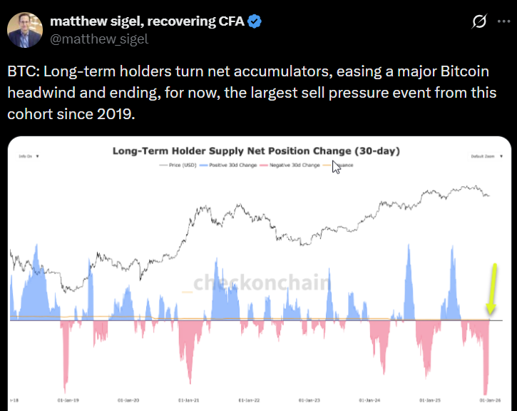 VanEckのデジタル資産リサーチ責任者Matthew Sigelは、過去30日間でビットコインの長期保有者が純蓄積者に変わったと述べており、これは2019年以来最大の売却イベント以来の動きだと説明しています。