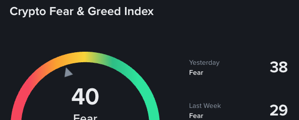 市場心理も改善している。Crypto Fear & Greed Indexは、ボラティリティ、取引量、ソーシャルメディアのセンチメント、市場の勢いを総合して0(極度の恐怖)から100(極度の貪欲)までの尺度で投資家の感情を測るもので、先週の29から今日の40へと上昇した。これは、通常投資の投げ売りを示す「極度の恐怖」ゾーンからの明確な脱却を示している。